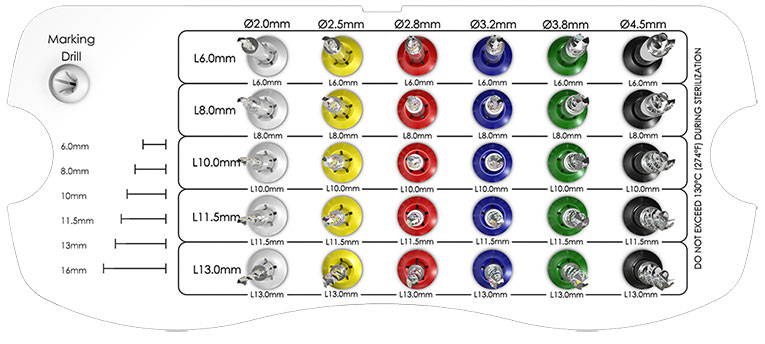 All drills are externally irrigated, intended for multiple use and are color-coded.